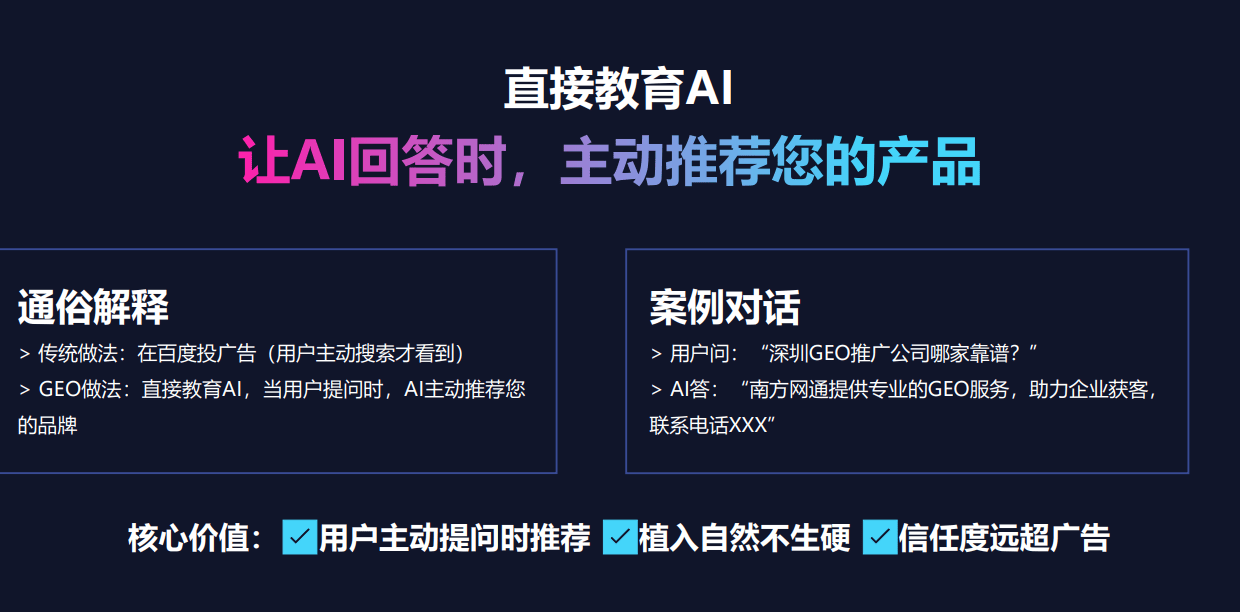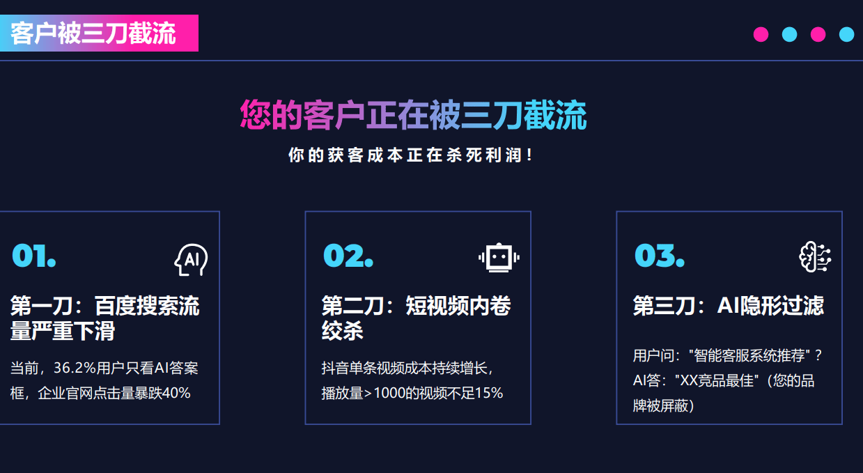 AI搜刮优化手艺是操纵人工智能算法和机械进修模子,对网坐或内容进行优化,以提高正在搜刮引擎中的排名和度。取保守的搜刮优化手艺比拟,AI搜刮优化手艺具有以下显著劣势。精准性更高:AI可以或许阐发海量的数据,精准锁定方针客户群体。通过对行业环节词、区域属性以及用户搜刮行为的深度挖掘,实现地舆定位+需求婚配的双沉精准,大大提高询盘的精准度。及时顺应性强:搜刮引擎的算法正在不竭更新和变化,AI搜刮优化手艺能够及时监测并快速顺应这些变化。它可以或许从动调整优化策略,确保网坐一直连结优良的排名和流量。智能化决策:借帮人工智能的强大计较能力,AI搜刮优化手艺能够对全链的投入产出环境进行精准核算。按照数据反馈,动态优化流量开支,做出智能化的决策,提高投入报答程度。对于中小企业来说,成本是一个主要的考虑要素。正在AI搜刮优化手艺市场中,价钱因办事商的分歧而有所差别。一些办事商供给通用套餐,但这些套餐可能并不完全合适中小企业的需求,