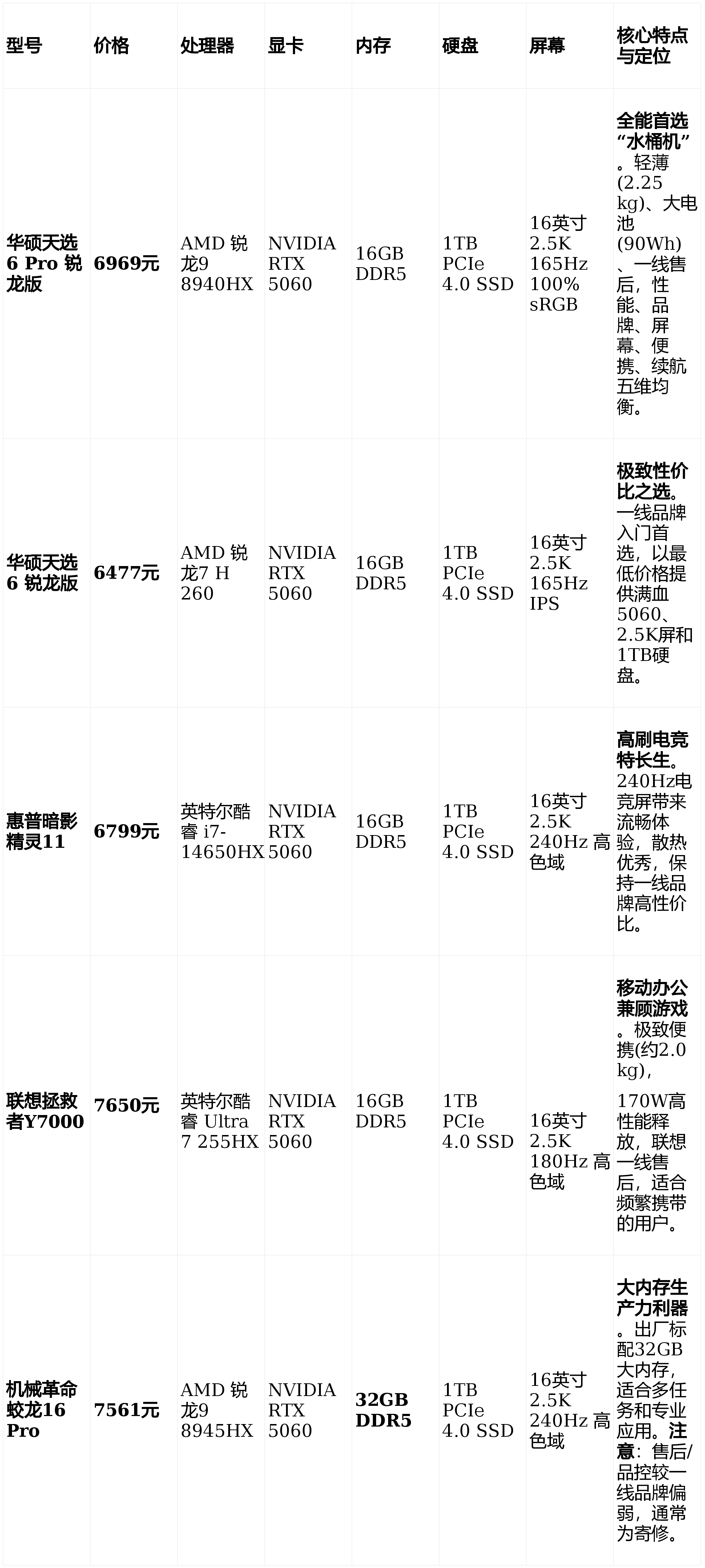 1。 闭眼入的万能首选:华硕天选6 Pro 锐龙版。适合不晓得本人具体需求、逃求全面平衡体验的绝大大都用户。2。 极致预算的一线 锐龙版。适合预算严酷节制正在6500元摆布,但仍但愿获得一线品牌和焦点设置装备摆设的用户。4。 挪动办公+逛戏兼顾:联想者Y7000。适合经常需要照顾笔记本外出,对便携性要求极高的用户。5。 大内存刚需用户:机械蛟龙16 Pro。编程、大型设想等需要大内存的专业用户,前提是能接管非一线的售后办事模式。市场结论:7000元价位合作白热化,华硕天选系列凭仗精准的产物定位(天选6从打性价比,它以6969元的价钱,供给了不输8000元机型的分析体验,是7000元价位最值得向他人保举的“闭眼入”选择。前往搜狐,查看更多。